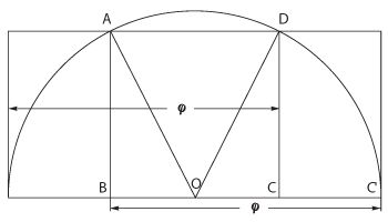 ƯÈ÷ ±× ºñ·Ê °¡¿îµ¥¼ 1:1.618À» ¥õÀÇ ºñÀ²À̶ó°í Çϸç, Ȳ±Ý·ü(golden ratio)À̶ó ÇÑ´Ù. Ȳ±ÝºñÀ²ÀÇ °£´ÜÇÑ ÀÛµµ¹ýÀº ¾Æ·¡ÀÇ ±×¸²°ú °°´Ù. ¿©±â¼ ABCD´Â °¢ º¯ÀÌ 1ÀÎ Á¤»ç°¢ÇüÀ̸ç O´Â BCÀÇ ÁßÁ¡, ADÀÇ ±æÀÌ´Â ÇÇŸ°í¶ó½ºÀÇ Á¤¸®¿¡ ÀÇÇÏ¿© ´ÙÀ½°ú °°Àº ¼ö½ÄÀÌ ¼º¸³ÇÑ´Ù.