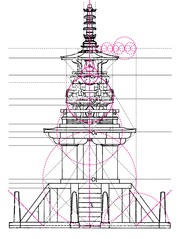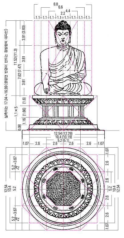 ÅëÀϽŶó½Ã´ë »çÂûÀÇ ¼³°è¿¡´Â °¢ º¯ÀÇ ±æÀÌ 3, 4, 5ÀÎ Á÷°¢»ï°¢Çü¿¡¼ ƯÈ÷ 5:4ÀÇ ºñ¸¦ ÅÃÇÏ¿© ¸¸µç Á÷»ç°¢ÇüÀ» ±âº»À¸·Î »ï°í ÀÖÀ¸¸ç ÀÌ Á÷»ç°¢ÇüÀÇ ´ë°¢¼±°ú Á¤»ç°¢ÇüÀÇ ´ë°¢¼±ÀÎ 1:¡î2ÀÇ ºñ°¡ ¸¹ÀÌ ÀÌ¿ëµÇ°í ÀÖ´Ù. ¡î2¿Í ¡î5´Â Á¤»ç°¢Çü¿¡¼ ÀÚ¿Í ÄÞÆÛ½º¸¦ ÀÌ¿ëÇÏ¿© °£´ÜÈ÷ ÀÛµµÇÒ ¼ö Àִµ¥ Èñ¶øÀÎÀÌ ¡î5¸¦ ÁÁ¾ÆÇß´ø °Í°ú´Â ´ëÁ¶ÀûÀ¸·Î ½Å¶óÀÎÀº ¡î2¿¡¼ ¾Æ¸§´Ù¿òÀ» ã¾ÒÀ½À» ¾Ë ¼ö ÀÖ´Ù.